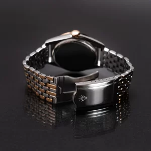 1940年代のマスターピースと呼ばれるヴィンテージウオッチの普遍美を再現。今回のシリーズ中で唯一のコンビネーションカラーモデルです。ベゼル、リューズ及びブレスレットの4列のコマにイオンプレーティングによるローズゴールドメッキを施しました。ピュアホワイトのダイアルにローマ数字のインデックス及びローズゴールドカラーのバトンハンドを配しています。 6モデル全て共通の(リューズを除く)ケースサイズは36mmと小さめのサイズとなっていますので、ペアウオッチとしてもお勧め致します。